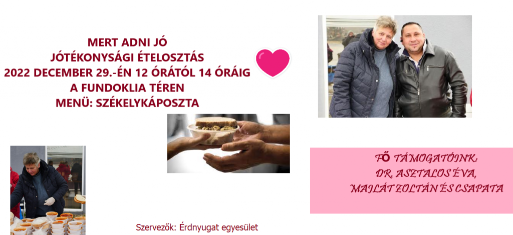Példát mutatva 2021-ben elkeztük a "Mert adni jó!" programunkat, amit minden év utolsó hetében megismétlünk. Ha csak egy napra is, de meleg ételt biztosítunk több családnak, amit támogatóink segítségével tehetünk meg.